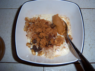 I didn't have the best start in the world this morning but I'm making do. I decided that I probably need the extra sleep and ignored my alarm for cycling class. Unfortunately once my brain is awake and turned on there is pretty much no turning it back off so I ended up getting up anyways. I decided to whip up some creamy banana oats for breakfast. In the mix:- 1/4 cup rice pudding