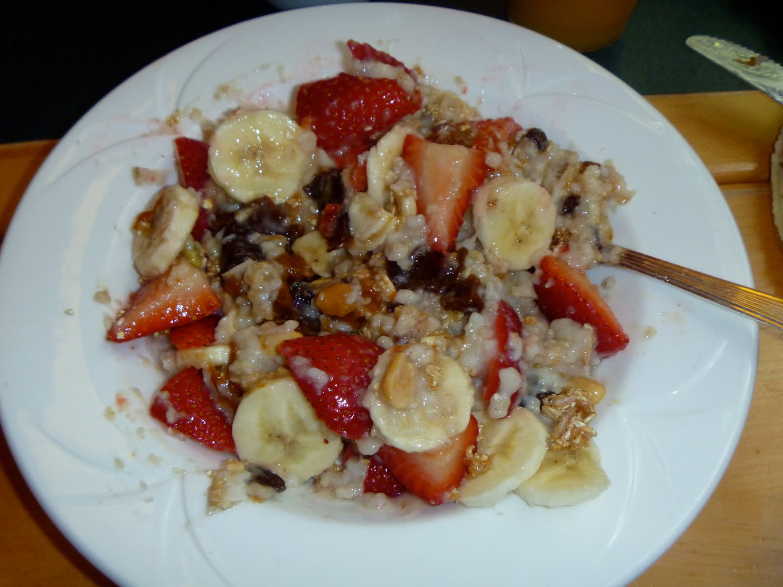 I wasn't in the mood for oats so I went for assorted fruit, a V8, and whole wheat toast with peanut butter which I had 1 and 1/4 of the slices.